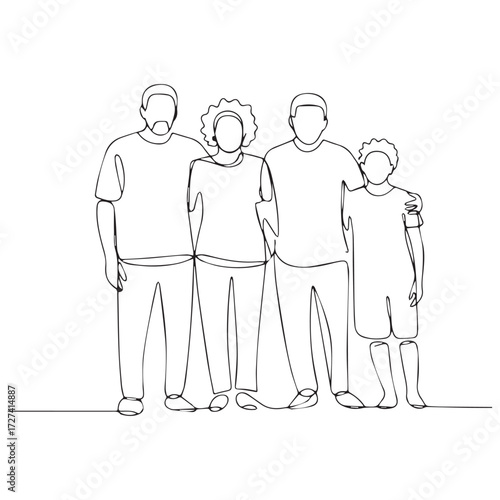 Continuous Simple black line art drawing of a family in a minimalist style on a white background.