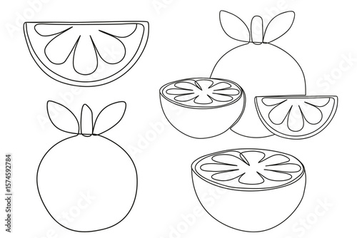 Contour Orange whole, half, cut slice orange fruit. Organic fruit. Flat style. Vector illustration for any design.