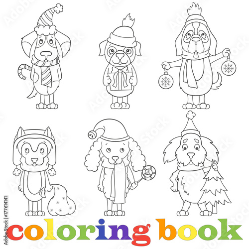 Contour set of illustrations with funny cartoon dogs on the topic of new year and Christmas, book coloring,a dark outline on a light background