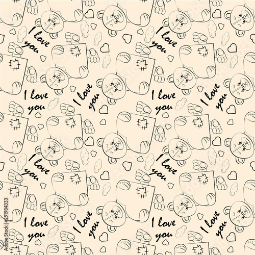contoured seamless childrens illustration of a little bear hugging a heart with I love you drawn on a checked notebook
