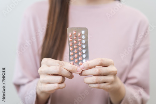 Contraception and pregnancy, menstruation concept, birth control pills asian young woman hand holding hormonal oral contraceptive medicine, take pharmaceutical to prevention, safe virus sex disease.