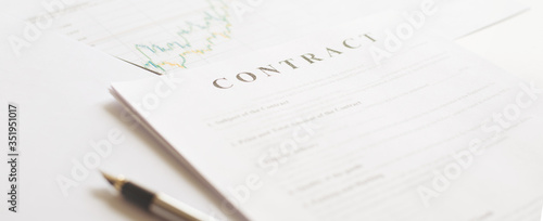 Contract paper and pen on white desk background. Focus on title Contract. Defocused pencil.