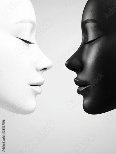 Contrast and Connection: A striking depiction of two faces, one in stark black, the other pure white, gazing at each other in silent contemplation, exploring themes of diversity, unity, and harmony.