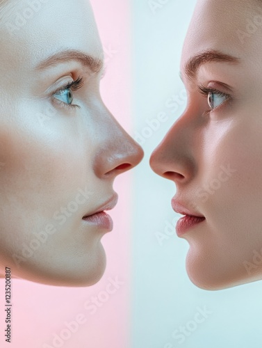 Contrast of age displayed with two faces highlighting aging signs and youthful skin in a modern setting. Generative AI