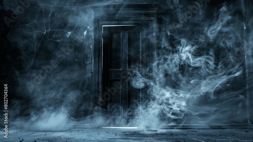 Contrast of light and dark with an open door leading to heaven or hell, shrouded in night mist and cobwebs, souls in pain visible in the haunting smoke
