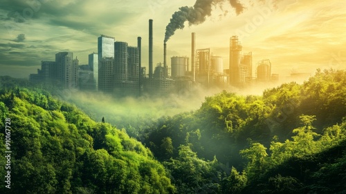 Contrasting Landscape of Industrial City and Lush Green Forest with Smokestacks and Pollution