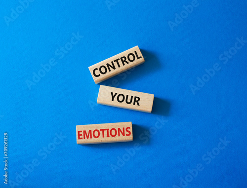 Control Your Emotions symbol. Concept word Control Your Emotions on wooden blocks. Beautiful blue background. Psychology concept. Copy space