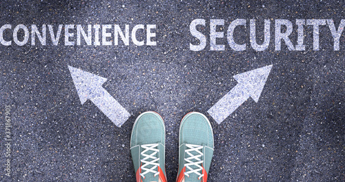 Convenience and security as different choices in life - pictured as words Convenience, security on a road to symbolize making decision and picking either one as an option, 3d illustration