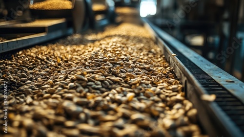 Conveyor Belt Filled with Sunflower Seeds in Food Manufacturing Facility