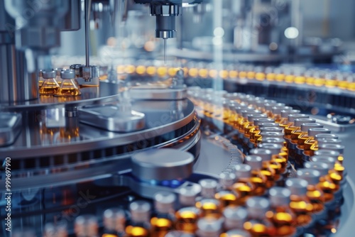 Conveyor belt filled with various bottles in a factory setting, suitable for commercial or industrial use
