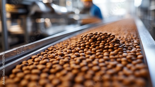 Conveyor belt with brown nuts in industrial factory setting