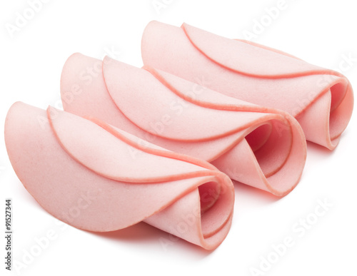 cooked boiled ham sausage or rolled bologna slices isolated on w