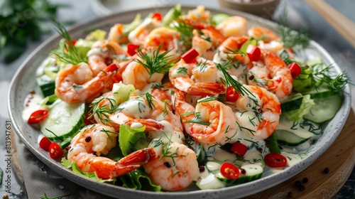 Cooked prawns with fresh salad and dill dressing served on a gray plate, garnished with red chili slices and herbs.