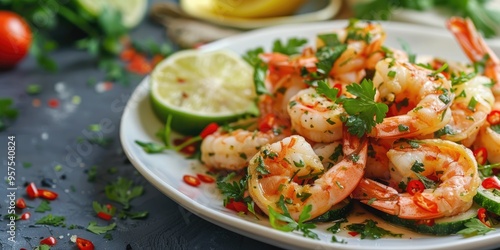 Cooked Shrimp and Seafood with Spicy Chili Sauce and Coriander Shrimp Salad with Lemon and Lime Fresh Shrimp on White Plate with Vegetables