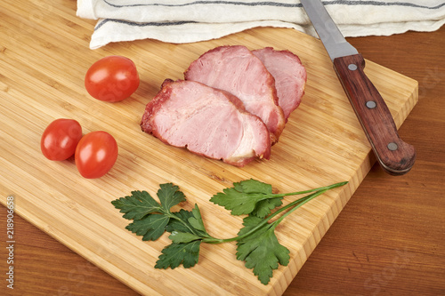 Cooked sliced pork barbecue steak on wooden cutting board.