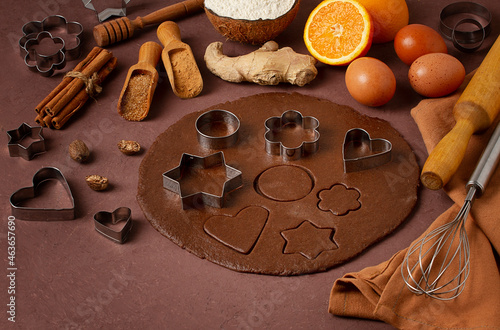 Cookie cutter and gingerbread ingredients, on a wooden table, top view, flat layout, selective focus, vintage toning,