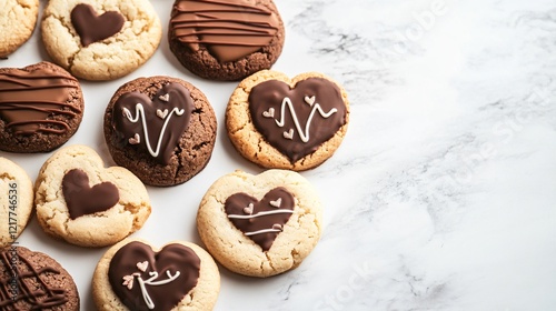 Cookies with love-themed messages written in chocolate, isolated on a white marble background