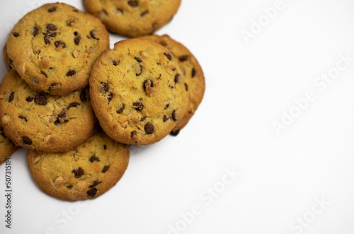 Cookies with pieces of chocolate on a white background
