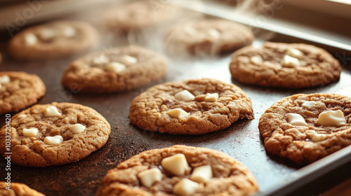 Cookies with white chocolate pieces on a baking tray, just out of the oven. Steam rising from the warm cookies. Cozy kitchen setting. --chaos