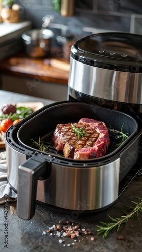 Cooking a perfectly seasoned steak in an air fryer during a cozy evening at home