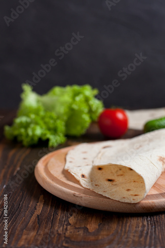 cooking burrito with greens, cucumbers, tomatoes and sausages on a round wooden board on a wooden background