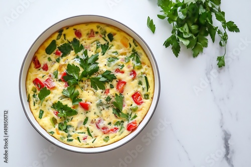 Cooking colorful frittata with fresh herbs and vegetables Brunch healthy eating