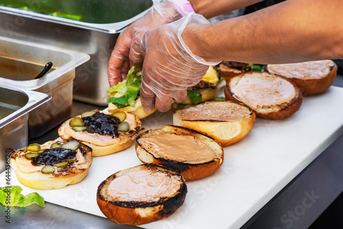 Cooking delicious Burgers. cooking meat burgers with bacon, cheese and vegetables, selective focus. bright plan.