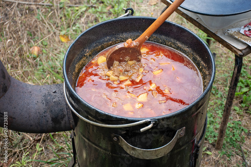 Cooking delicious kettle goulash with in a large cauldron outdoors