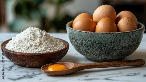 Cooking ingredients flour, eggs in bowl, yolk on spoon, counter, green plant