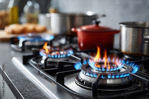 Cooking on a modern kitchen stove with colorful flames and various cookware