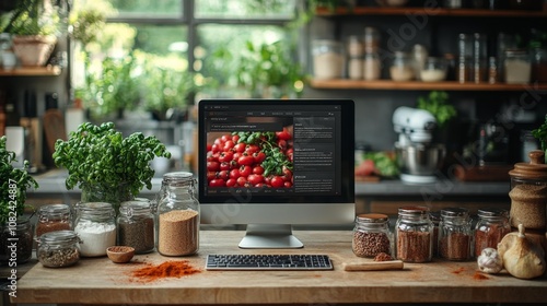 Cooking School Website Monitor Mockup with Spices and Chef's Hat. Generative AI