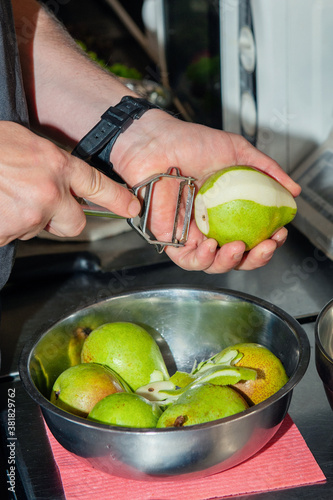 Cook's hands clean the pear. Preparation of the pears to caramelize and cook chutney. Close up