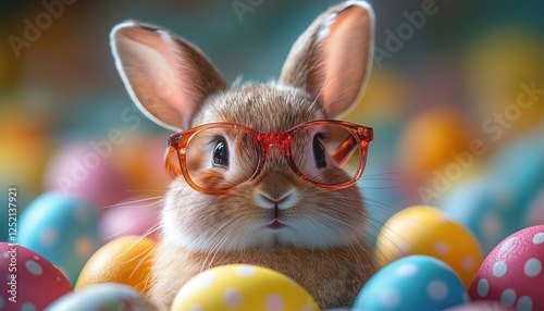 Cool bunny wearing sunglasses surrounded by colorful Easter eggs