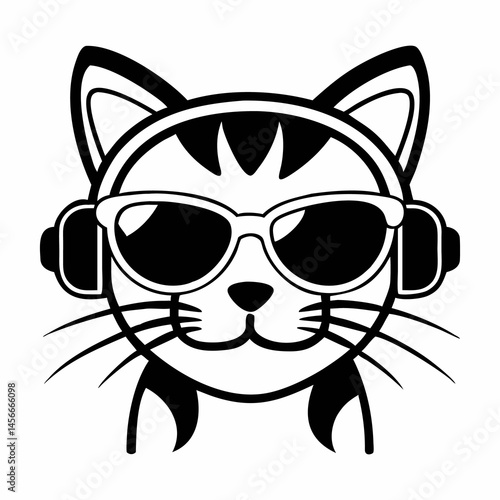 Cool Cat Wearing Sunglasses and Headphones, Black and White Vector Illustration.