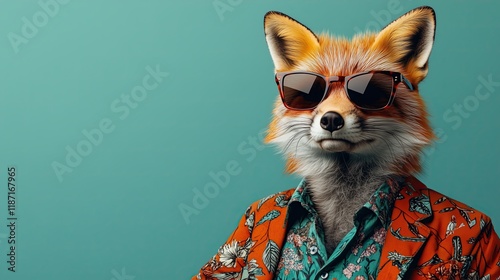Cool looking fox wearing funky fashion dress - jacket, shirt, dark shades sunglasses, stylish animal posing