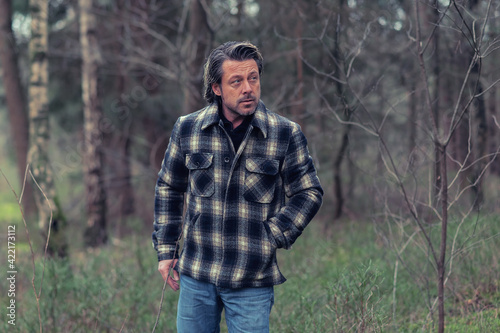 Cool man in checkered coat in the woods.