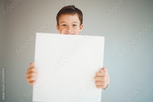 cool young boy is holding white sign in front of grey background during corona crisis
