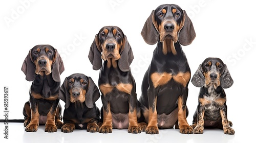 Coonhound Dog Family. Dogs Sitting in a Group on White Background