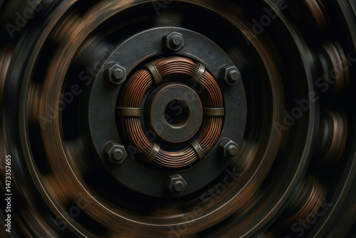 Copper coil and metal bolts in industrial power plant generator create dynamic and powerful mechanical energy source with dark background
