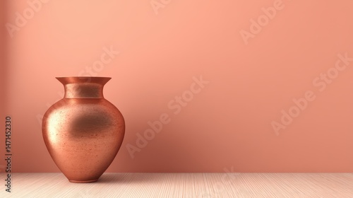 Copper Vase Still Life on Wooden Surface Against Peach Wall Minimalist Interior Design Home Decor Studio Shot