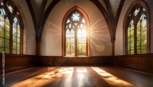 copy space featuring a tranquil scene of a church window with soft sunlight streaming in