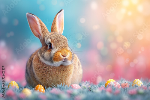 Copy space of an Easter bunny with Easter eggs, bright and colorful background with small painted eggs for Holy Week activities