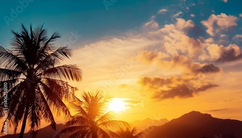 Copy space of silhouette tropical palm tree with sun light on sunset sky and cloud abstract