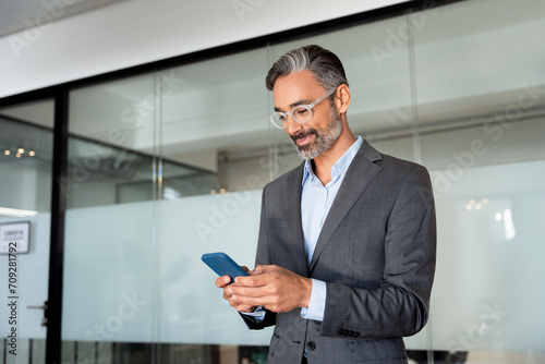 Copy space with smiling mature Latin or Indian businessman holding smartphone in office. Middle aged manager using cell phone mobile app. Digital technology application and solutions for business.