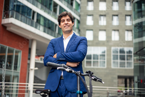 copyspace closeup Businessman in blue suit with electric bike in city financial district