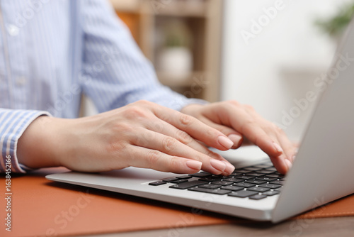 Copywriter using laptop at wooden table indoors, closeup