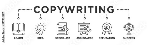 Copywriting banner web icon vector illustration concept with icon of learn, idea, specialist, job boards, reputation, success