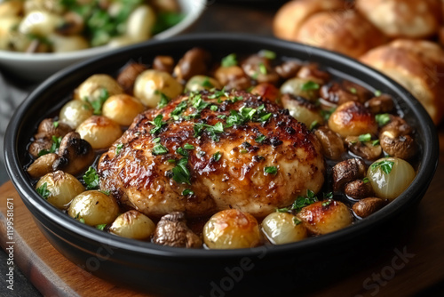 Coq au Vin: A Classic French Stew with Chicken Braised in Rich Red Wine, Featuring Mushrooms, Pearl Onions, and Aromatic Herbs