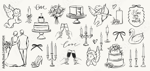 Coquette Wedding Doodle Set in Whimsical Vintage Style.