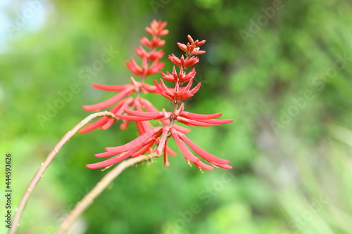Coral bean or Erythrina herbacea Florida native unique red color wildflower shrub blooms in spring have bean seeds green